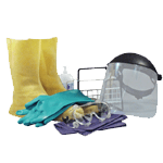 Kit includes splash-proof goggles, face shield, vinyl apron, nitrile gloves, shoe covers, and emergency eyewash bottle